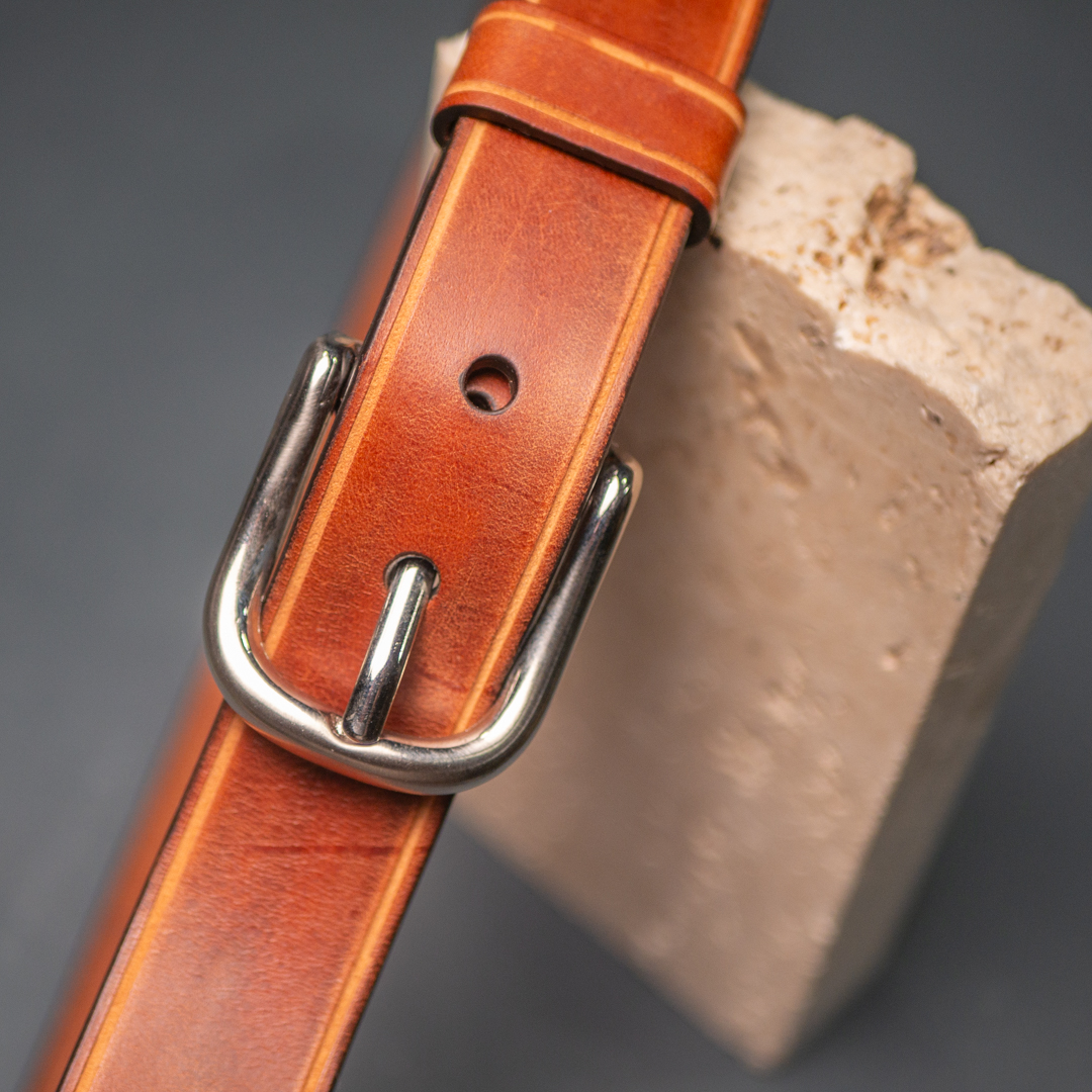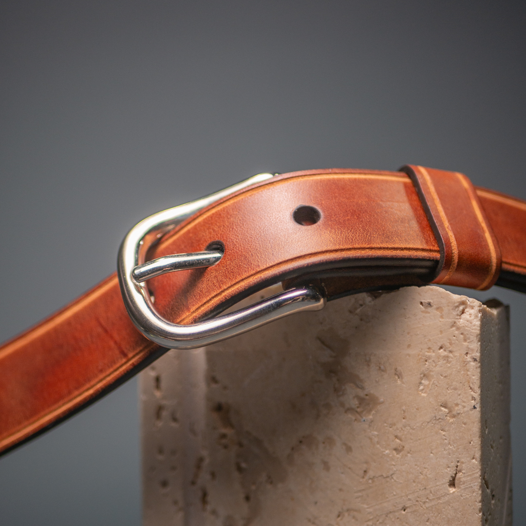 La più classica delle cinte. Una striscia di cuoio toscano resistente e che il passare del tempo renderà sempre più bella.
