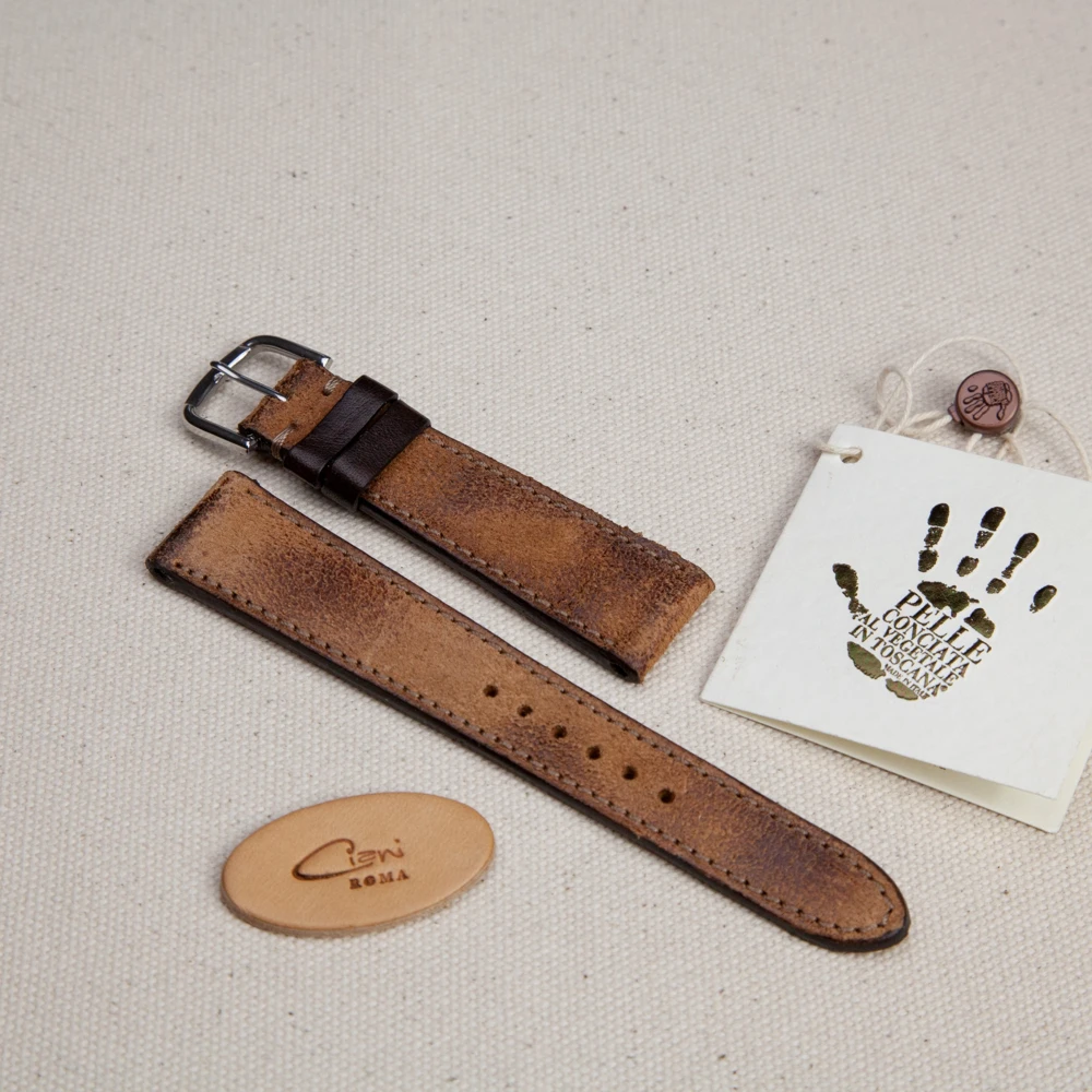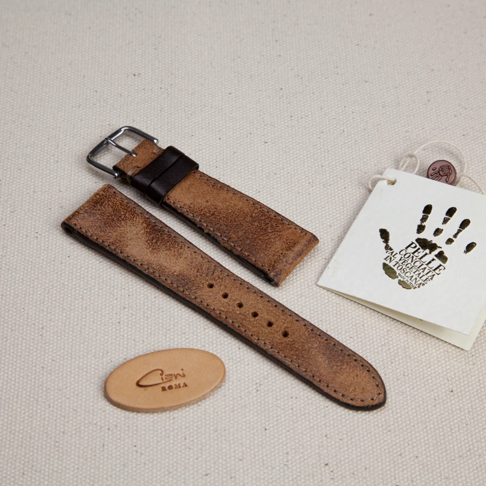 Un cinturino dal carattere autentico e naturale, realizzato in pelle di crosta toscana conciata al vegetale, completamente a mano nel laboratorio Ciani Roma.