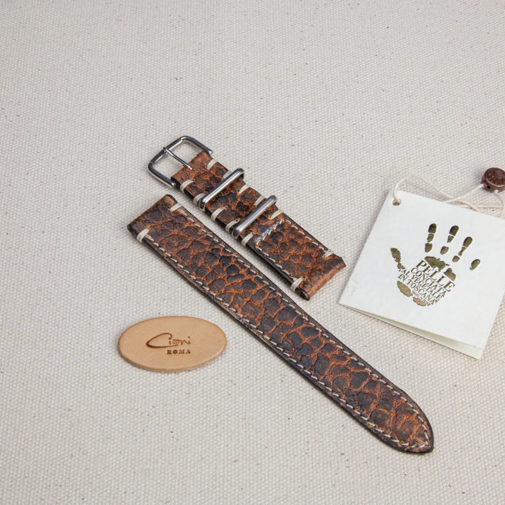 Un cinturino in cuoio toscano conciato al vegetale, lavorato interamente a mano nel laboratorio Ciani Roma.