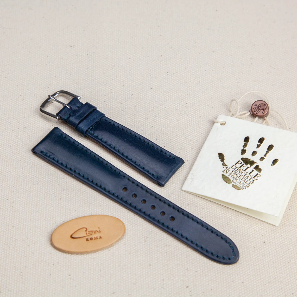 Cinturino artigianale in cuoio blu notte conciato al vegetale, realizzato a mano nel laboratorio Ciani Roma.