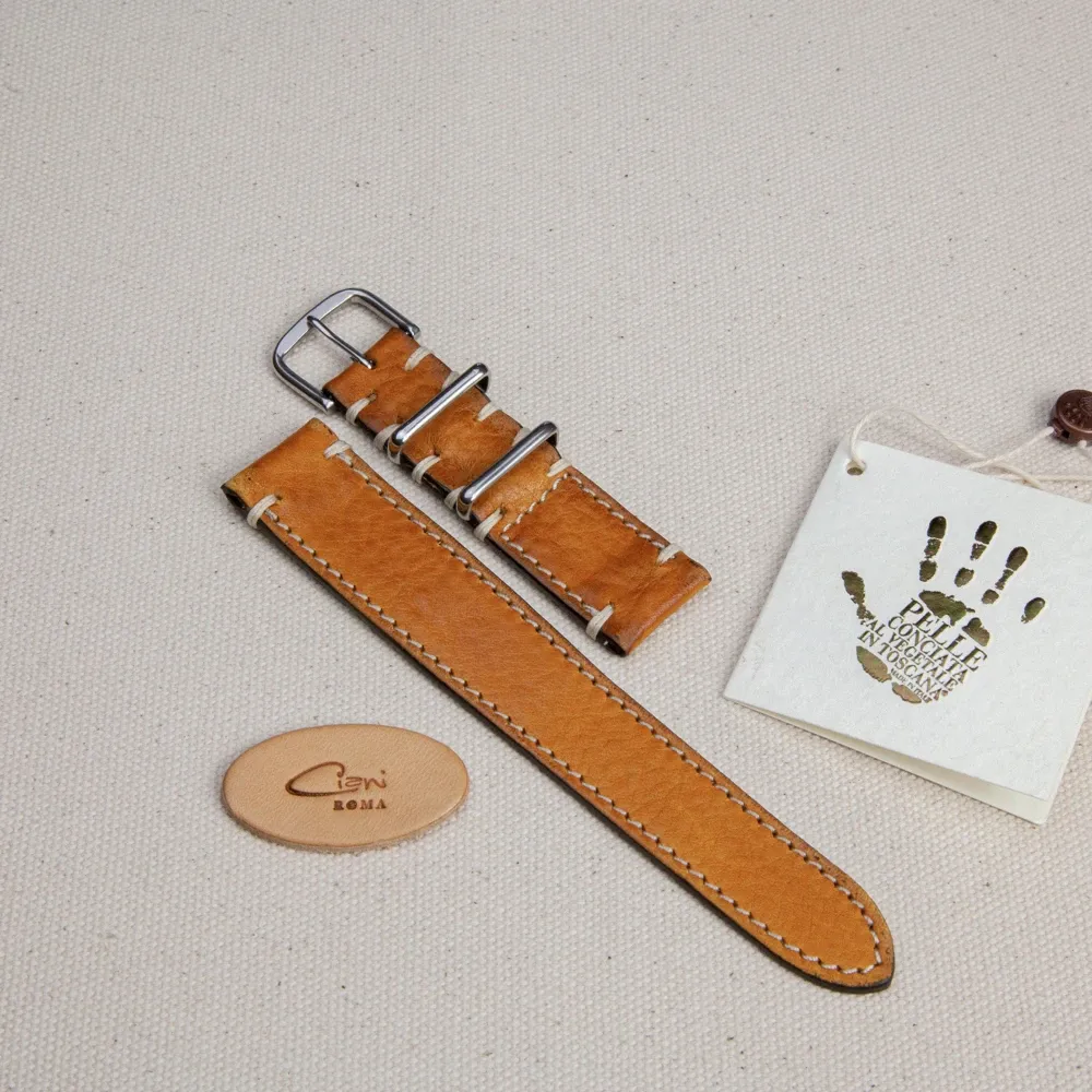 Un cinturino dallo stile autentico e dal carattere deciso, realizzato in cuoio toscano conciato al vegetale e lavorato interamente a mano nel laboratorio Ciani Roma.