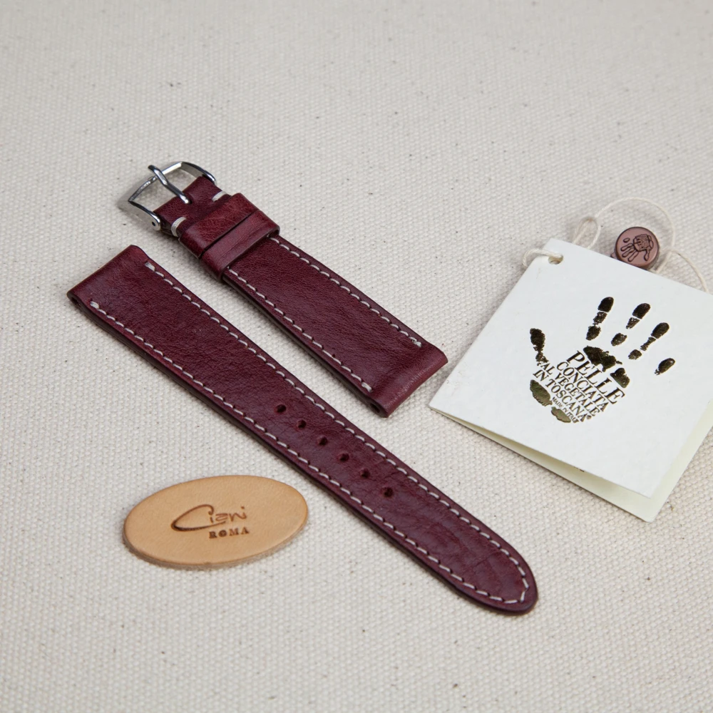 Cinturino artigianale in cuoio magenta conciato al vegetale, realizzato a mano nel laboratorio Ciani Roma.