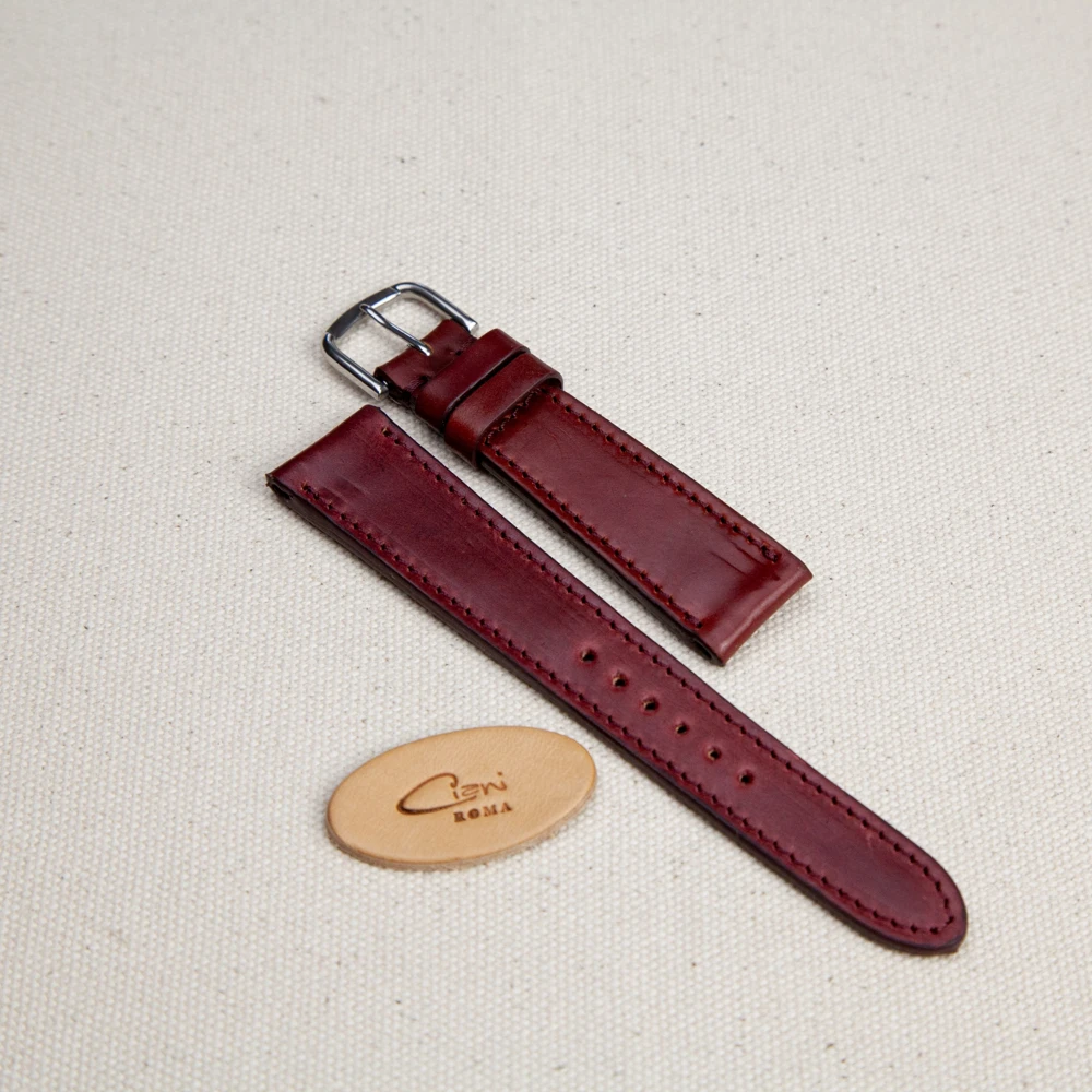 Cinturino artigianale in shell cordovan bordeaux, lavorato a mano nel laboratorio Ciani Roma.