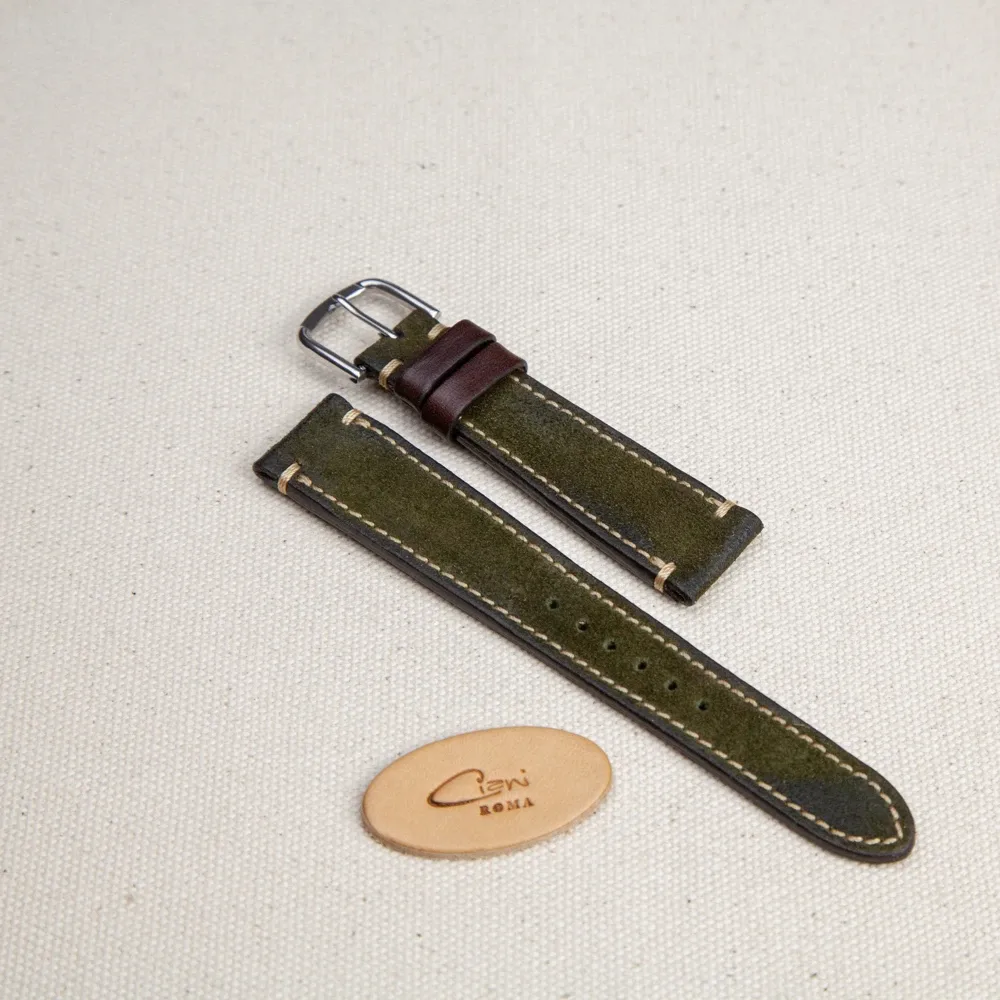 Un cinturino che combina eleganza e comfort, realizzato in pelle scamosciata toscana e cucito interamente a mano nel laboratorio Ciani Roma.